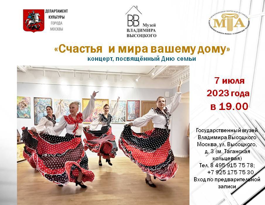 7 июля 2023 года в 19:00 на сцене театрально-концертного зала Государственного музея Владимира Высоцкого при участии благотворительного фонда «Славянские традиции» состоится праздничная концертная программа «Счастья и мира вашему дому», посвященная Дню семьи.
