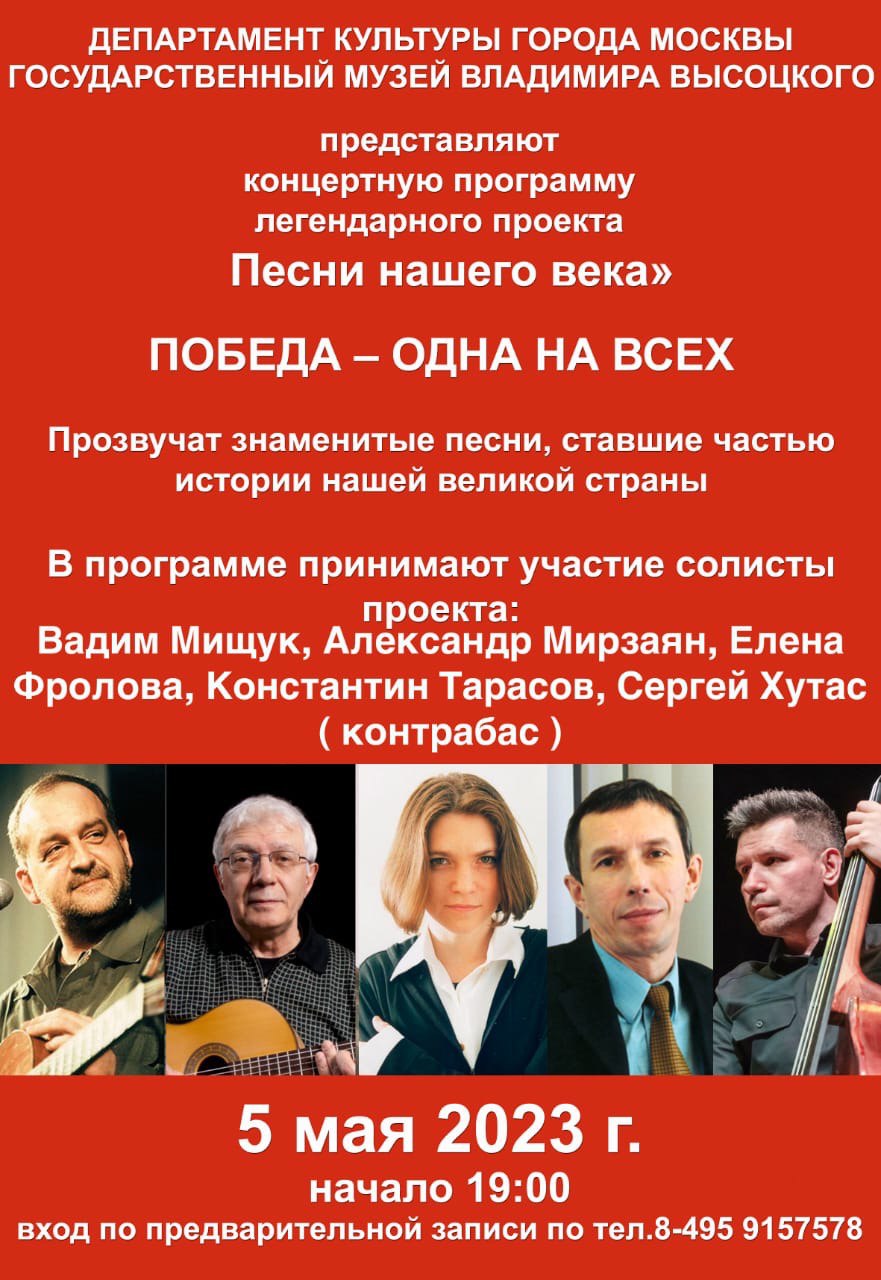 5 мая в 19:00 Государственный музей Владимира Высоцкого совместно с легендарным проектом «Песни нашего века» представляют концертную программу «Победа – одна на всех», посвященную празднованию Дня победы. Этот великий праздник является символом мужества, стойкости и героизма нашего народа. В программе прозвучат знаменитые песни, ставшие частью истории нашей великой страны, наполненные гордостью и любовью к Родине. Эти произведения напомнят о великом подвиге нашего народа, отстаивавшего свою свободу и независимость на полях сражений и на фронте труда.