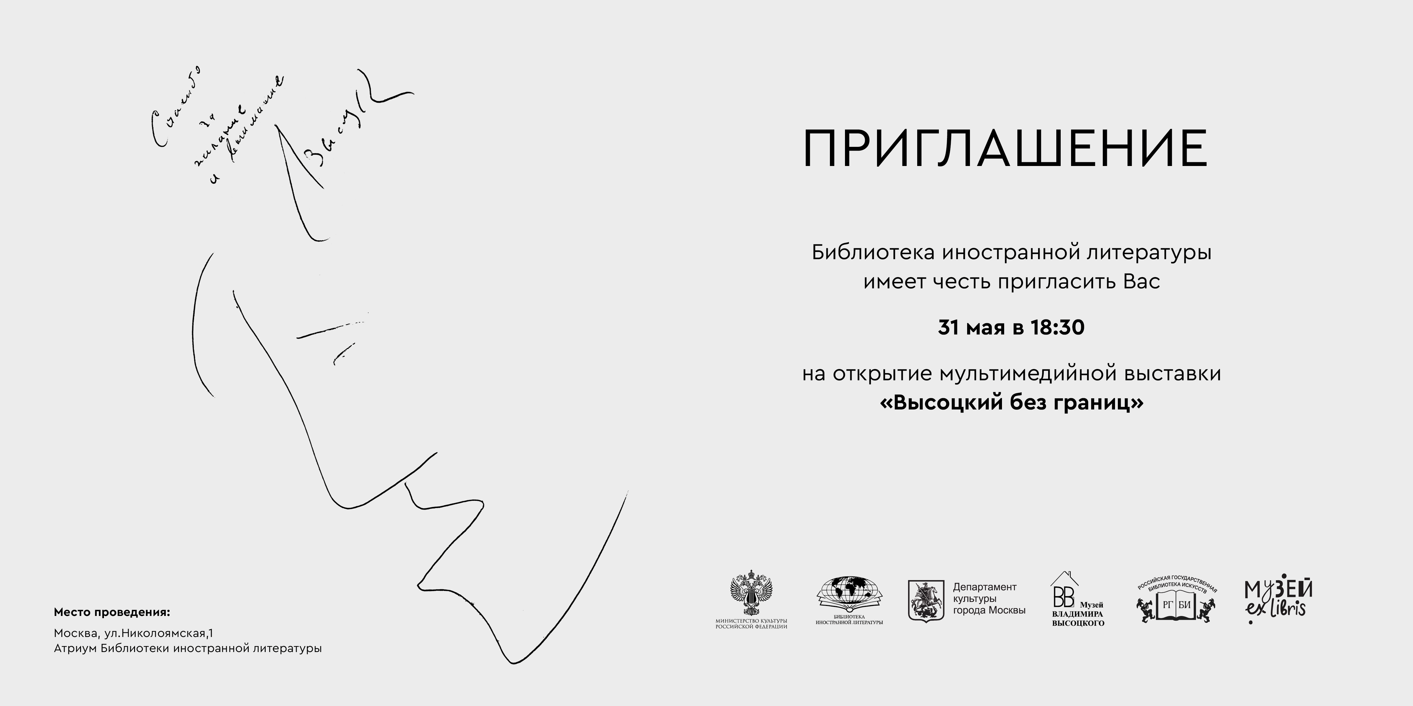 31 мая в 18:30 в Атриуме Библиотеки иностранной литературы состоится открытие мультимедийной выставки «Высоцкий без границ», подготовленной совместно с Государственным музеем Владимира Высоцкого в Москве при участии РОО «Творческое объединение «Ракурс», Российской государственной библиотеки по искусству и Музея экслибриса и миниатюрной книги Международного союза книголюбов.