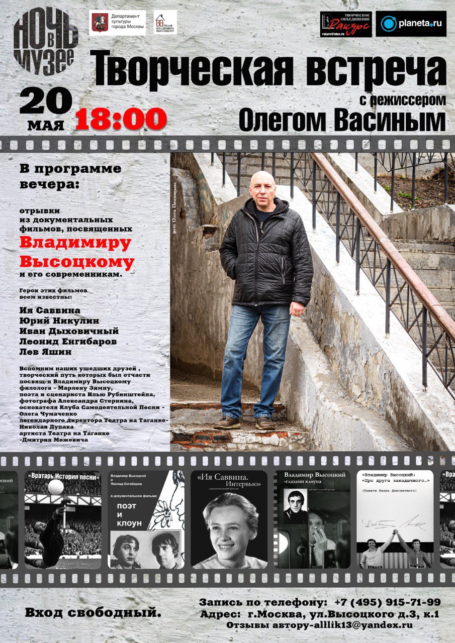 20 мая в 18:00 Государственный музей Владимира Высоцкого приглашает посетить творческую встречу с режиссером Олегом Васиным. В программе вечера: отрывки из документальных фильмов, посвящённых Владимиру Высоцкому и его современникам.
